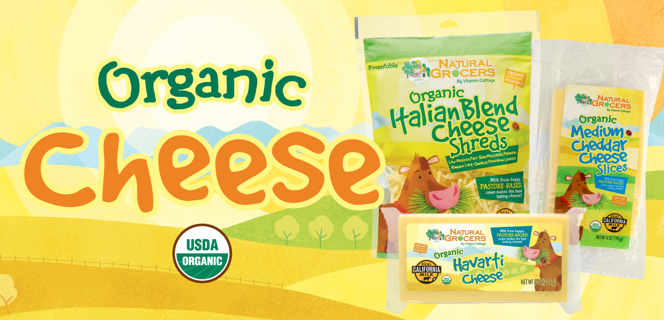 Our cheese is pasture based and certified organic, without a hormone or antibiotic to be found. Each bite is silky smooth with nothing artificial to smother its natural flavor and color. When it comes to rennet, we use an organic-approved alternative to the animal kind. When it comes to the planet, our cheese-making partners excel at recirculating water and recycling cardboard. Havarti Slices or Parmesan Shreds, Mexican Blend or Sharp Cheddar—we have all your favorite ways to say, “cheese.” Now smile for the camera, it’s time to party because Natural Grocers just put its name on the best cheese in town.