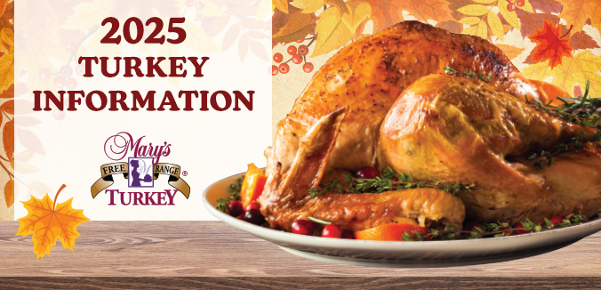 Because we have the highest quality turkeys in town! That’s why we partner with Mary’s, a family-run company, just like us, to provide you with the most delicious, wholesome turkeys. Mary’s emphasizes quality over quantity and prioritizes animal welfare over everything else. Their turkeys are fed a nutritious diet, free from animal by-products, antibiotics, arsenic-based growth promoters, and GMOs. Furthermore, they are not pumped full of other sly additives after harvest (trust us there are lots). They spend ample time outdoors roaming in areas four times the size of areas provided by the average commercial turkey ranch. When you buy a turkey from us, you’re getting the best quality, and you’re getting it from real people—the kind who could be your next-door neighbor. This is food you can trace every step of the way, from the ranch to your table.
