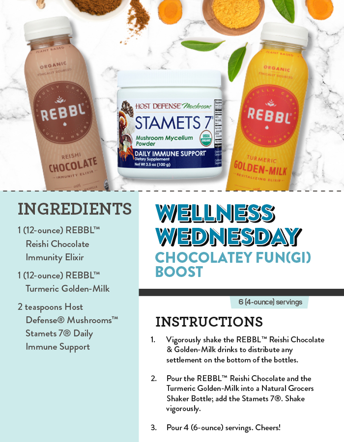 The REBBL™ Reishi Chocolate Immunity Elixir is a stress busting and immune support tonic all on its own, owing to the coconut milk and reishi mushroom it contains. We’ve added REBBL™ Turmeric Golden-Milk to it to take it to another level giving you a bit of fortifying turmeric to help the brain rebound from chronic stress, support healthy inflammatory levels and a balanced immune response. Then we added an extra boost of immune supporting mushrooms. Can anyone say Dynamic Trio?*
